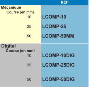 • Force de mesure : 1,5 N pour comparateur course 10 mm et 50 mm et 1,8 N pour comparateur course 25 mm